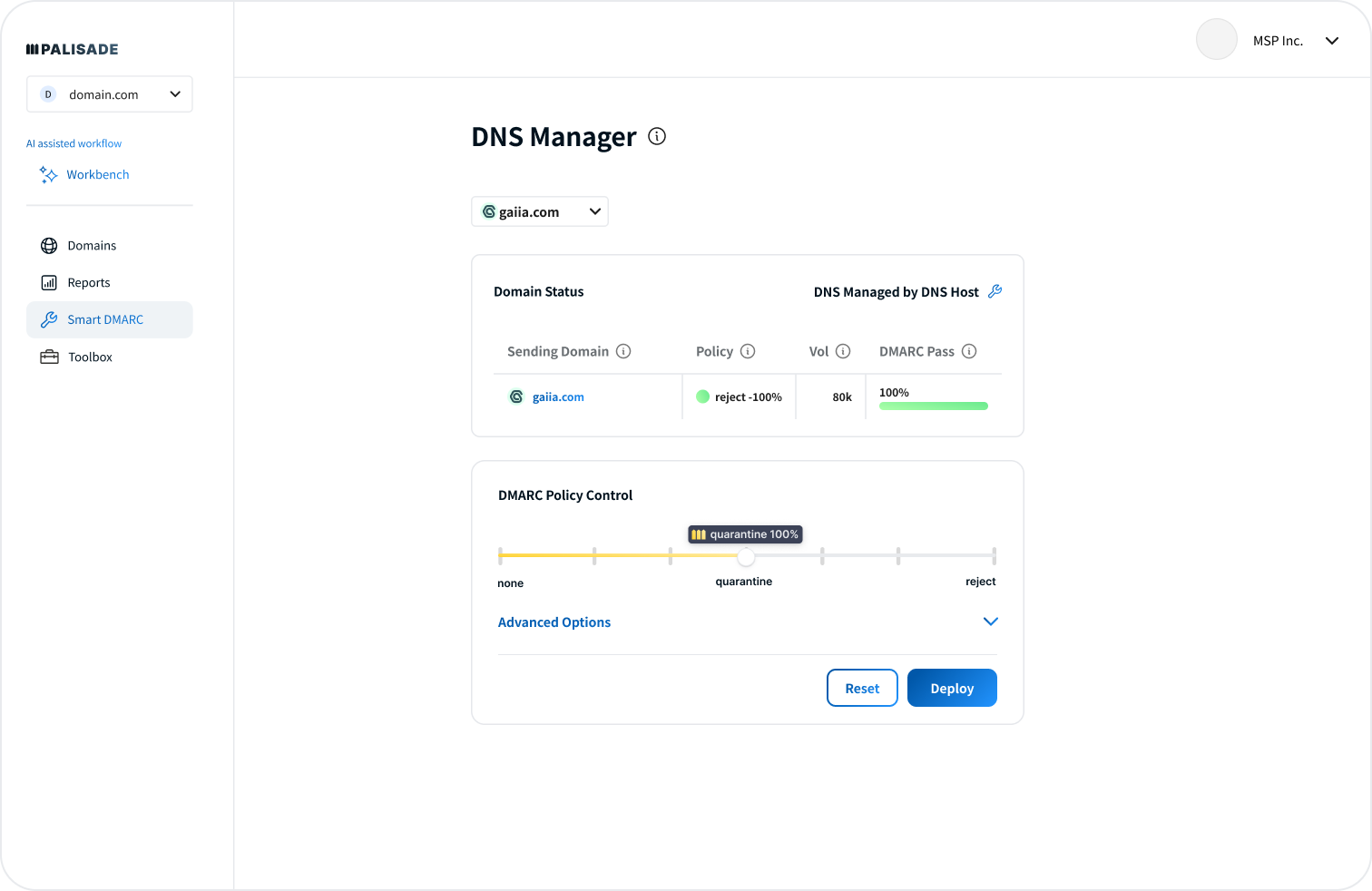 Palisade is an excellent choice for Small to Medium Businesses (SMBs) and organizations that prioritize a straightforward, efficient DMARC implementation. Its intuitive interface and guided approach reduce the learning curve, allowing businesses to quickly achieve DMARC enforcement without extensive technical resources.